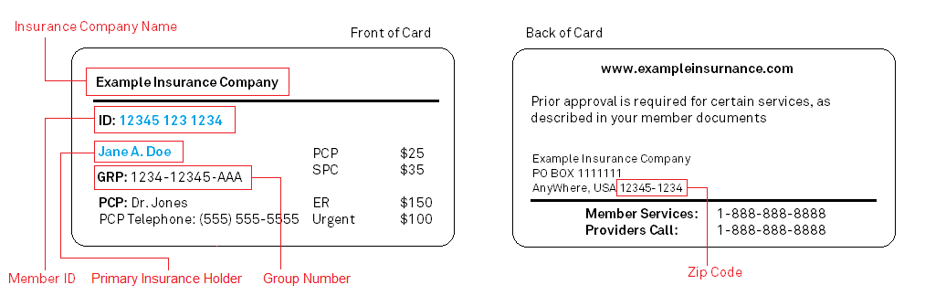 We need the name of your insurance company, the name of the primary insurance holder, the member ID number, and if applicable, your group number. You should be able to find the insurance company name, member ID, group number, and primary insurance holder on the front of your card. Click the image below to see an example of an insurance card.