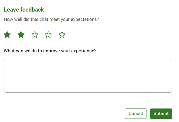 You can select from 1–5 stars. A 1-star choice means the chat was very bad, and a 5-star choice means the chat was excellent. If you pick 3 stars or fewer, the What can we do to improve your experience? box displays, where you can type comments: