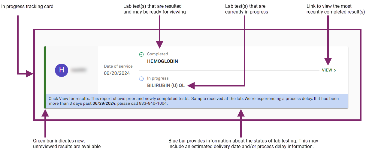 If you recently visited a patient service center, had your sample collected at your doctor's office, or had your sample collected at home, check the In progress section of the Results page to see the estimated delivery date(s) for your lab results.